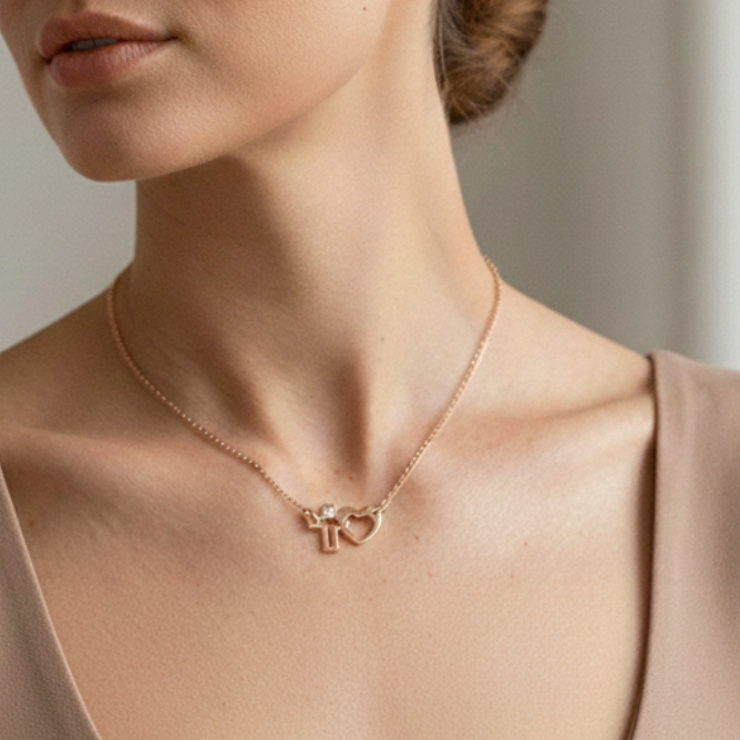 Le collier Croix-Cœur est bien plus qu'un simple accessoire. Il incarne une promesse, un souvenir ou une conviction. Sa structure en or rose, particulièrement tendance et douce pour la peau, apporte une chaleur moderne qui s'adapte à toutes les carnations.