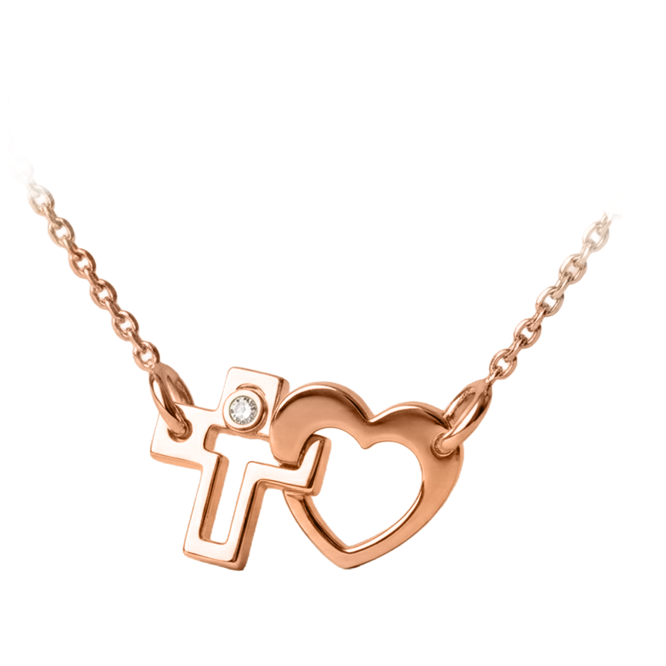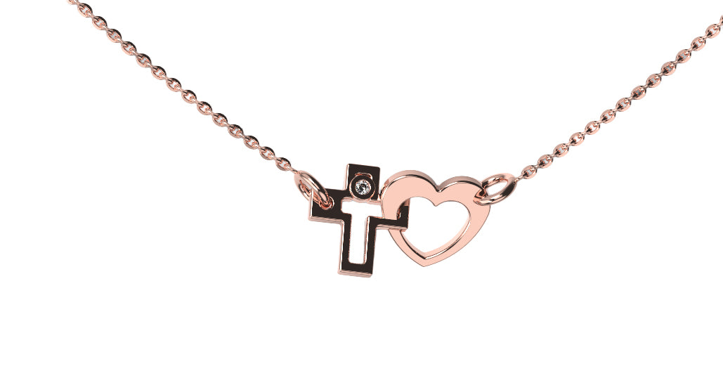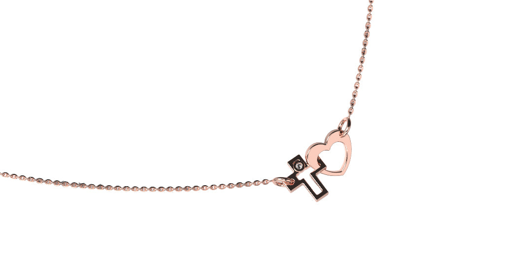 Sublimez votre décolleté avec le collier Croix-Cœur, une création exclusive alliant finesse et symbolisme. Confectionné en or rose 18 carats, ce bijou unique entrelace une croix graphique et un cœur épuré, rehaussé d'un scintillant diamant de centre. Un cadeau idéal pour célébrer l'amour et la foi avec élégance.